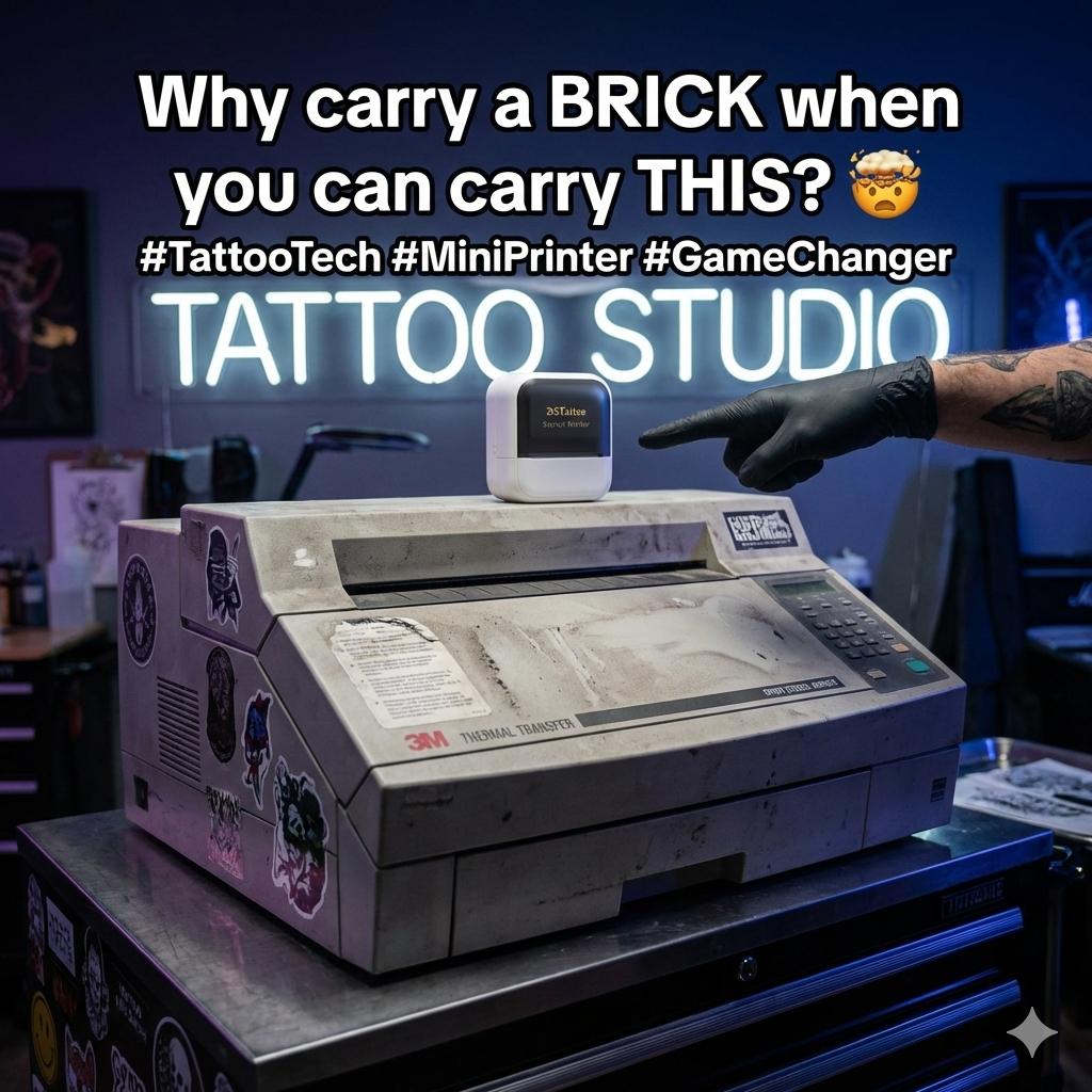 D5 Mini Tattoo Stencil Printer. It includes a tattoo printer machine and 20pcs transfer paper. The printer is compatible with phone , as indicated in the product information. This setup is perfect for anyone looking to start tattooing.